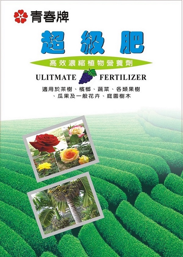 超級肥係根據各類植物養份需求所研製而成的濃縮質物營養素,其特性維能提供各種固定植物生長營養素,以延長肥效及促進有機物分解,以增強肥份的有益微生物繁殖所需之營養成分,對茶樹、檳榔、蔬菜;各類果樹及花卉、庭園樹木用作基肥,有非常顯著的效果。